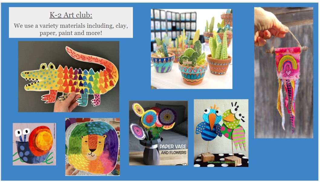 Students will be using a variety of materials to create 2D and 3D pieces of art to take home during the course of this class. I can't wait to see you in Art Club!
